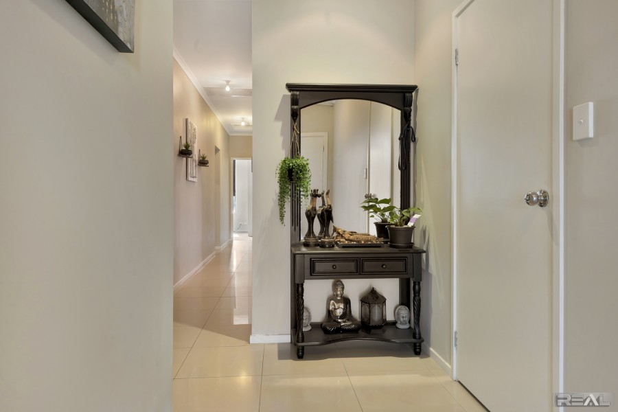 Upon entry, you are greeted by high ceilings and impressive gloss tiled flooring from front door to rear glass sliding door encouraging light to reflect and flow throughout the home.