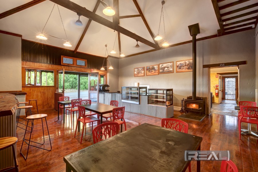 The second entrance gracing the side road boasts double timber doors plus servery windows and blessed with raked ceilings and more pendant lighting. This expansive room would make for the perfect family room or main room for a business. A large servery coupled with a cake refrigerator and 3 tier pie warmer grace this area plus washing facilities and a large breakfast bar eatery. A mood setting combustion heater with amazing ceiling fans plus ducted evap A/C will keep the elements at bay all year round. You couple this with approx. 500 mil sandstone walls and you have the recipe for success. This amazing area will showcase your produce or products in a very aesthetically pleasing way.