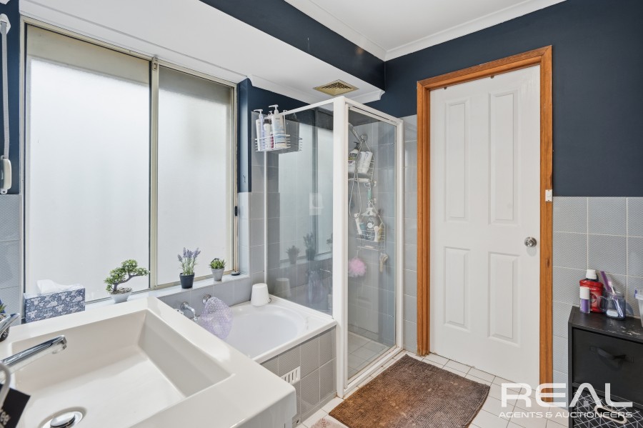 Bathroom features shower, bath and vanity - clean, neat and ready to move in, with scope to add your own modern updates over time.