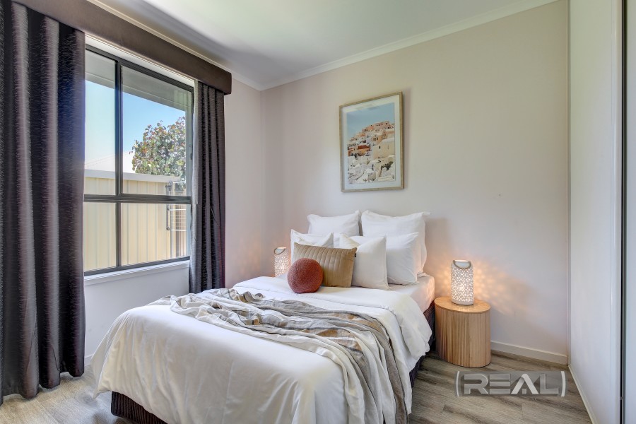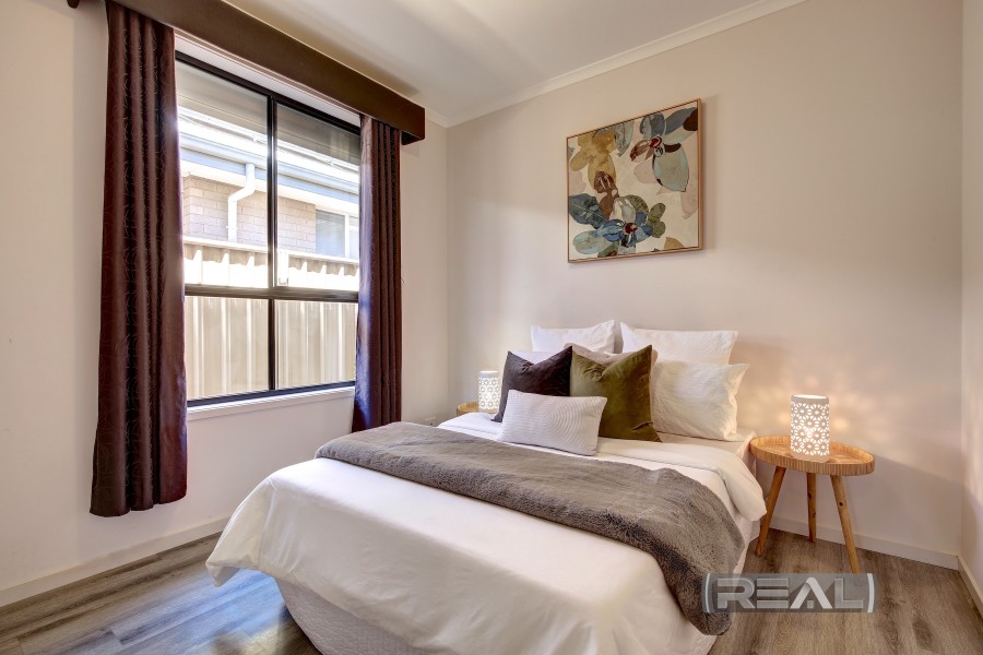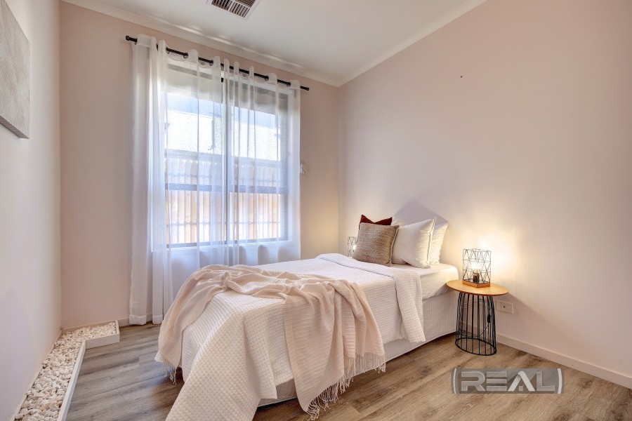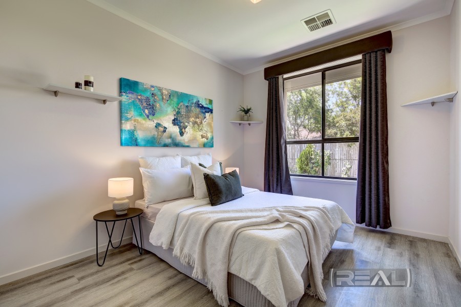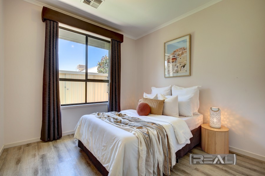 The well-proportioned master bedroom is a true retreat, complete with elegant curtains, three windows that create a bright and inviting atmosphere, and his-and-hers walk-through robes offering ample storage and hanging space. A ceiling fan, cavity sliding door, and neutral colour palette enhance the calm and comfortable feel found throughout the home.