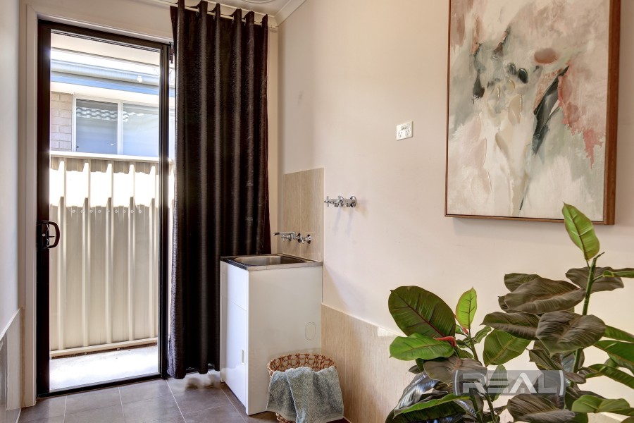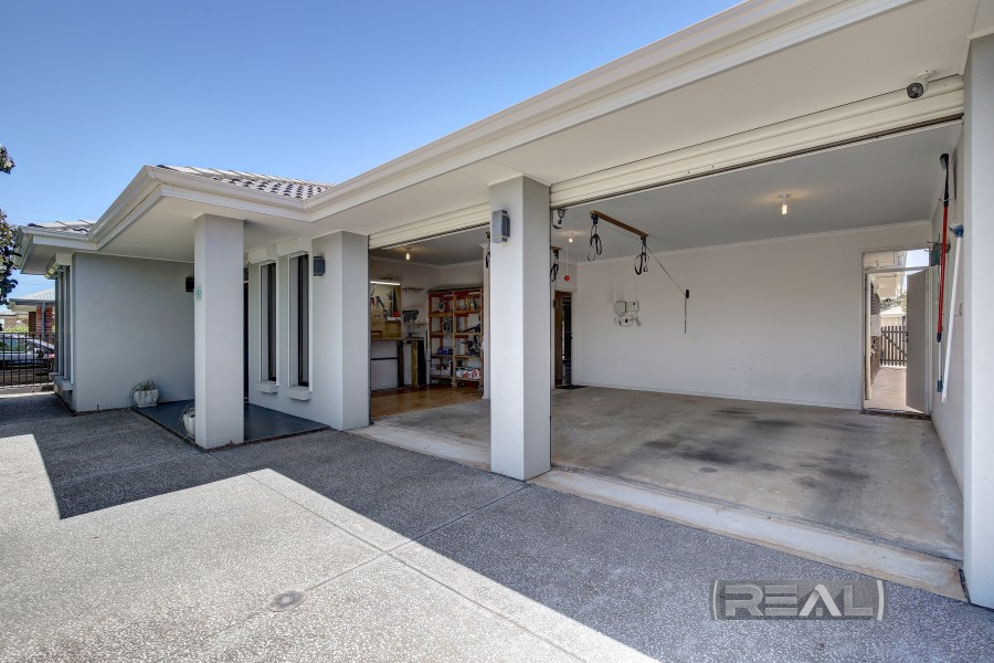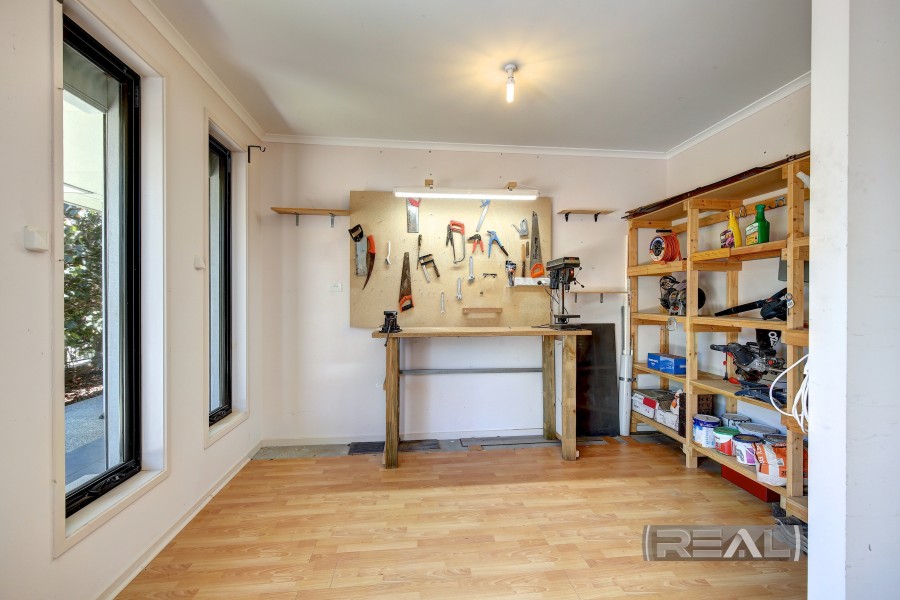 The double garage features electric roller doors and internal access to the impressive workshop, complete with bench space, storage, and two windows that allow natural light to fill the area. There is also provision for two additional off-street parking spaces, ideal for a growing family. The exposed aggregate concrete double driveway completes this true masterpiece. The home is also NBN-enabled with fibre-optic connection.