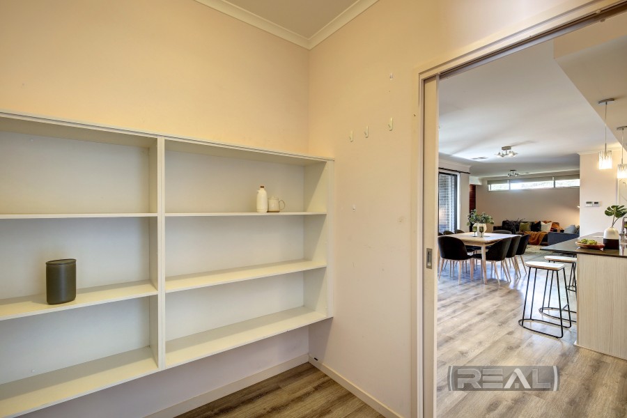 Upon entry, you are welcomed by a long, separate hallway featuring durable 8mm floating floors that flow through all high-traffic areas. A striking Meranti feature wall, enhanced with mood lighting, sets the tone for the quality and style found throughout the home. An abundance of floor-to-ceiling linen cupboards provides excellent storage and adds further practicality. The home opens into a spacious open-plan living area that forms the heart of this impressive residence, offering ample room for a growing family.