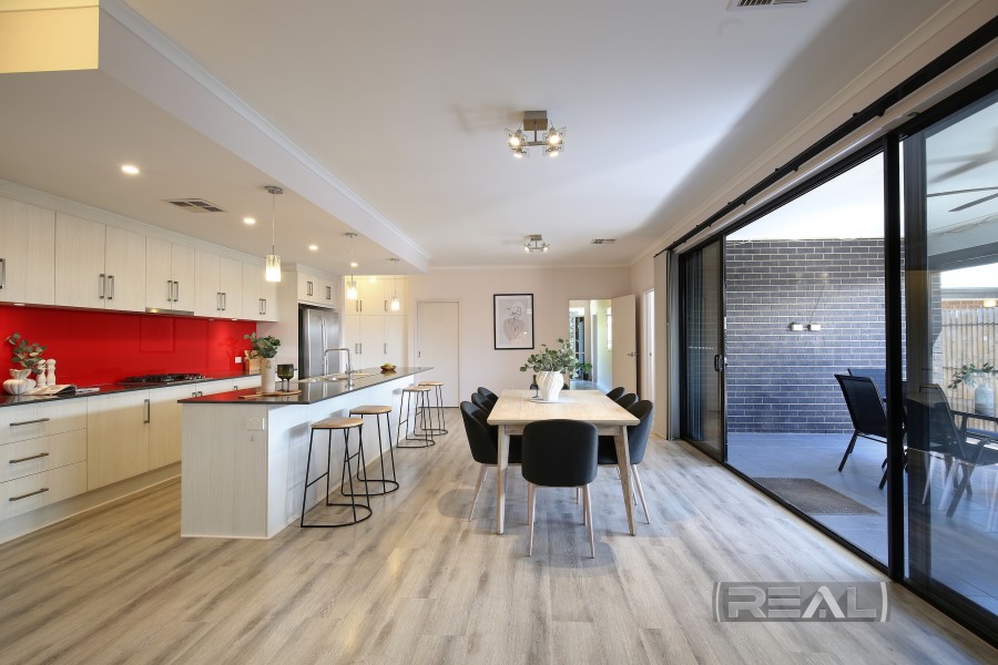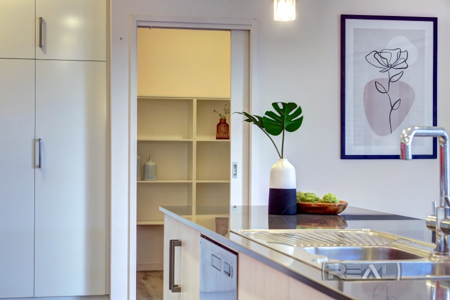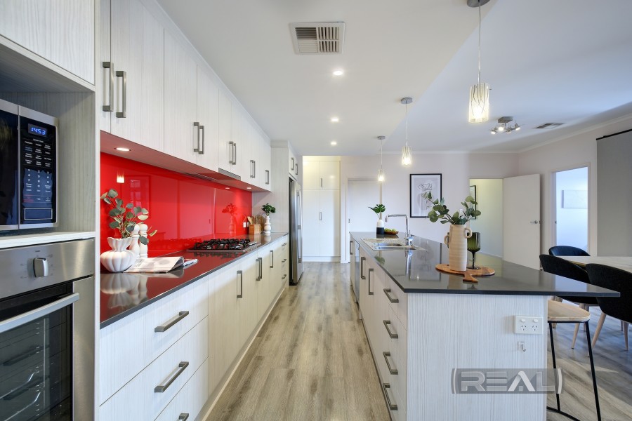 The kitchen is truly a work of art and overlooks the expansive living space, featuring all the modern "bells and whistles." Highlights include a generous walk-in pantry with extensive shelving, a large island bench with breakfast bar, power points, dual sinks, a stainless-steel Asko dishwasher, and plentiful cupboards and drawers. There is provision for a double-door fridge/freezer, complemented by an eye-catching red glass splashback. Cooking is a pleasure with the stainless-steel four-burner gas cooktop (including wok burner) and stainless-steel oven, all enhanced by overhead cabinetry and a full bulkhead with pendant lighting. Additional pantry storage is available, with convenient internal access from the garage-making grocery days effortless and keeping you dry during wet weather.
