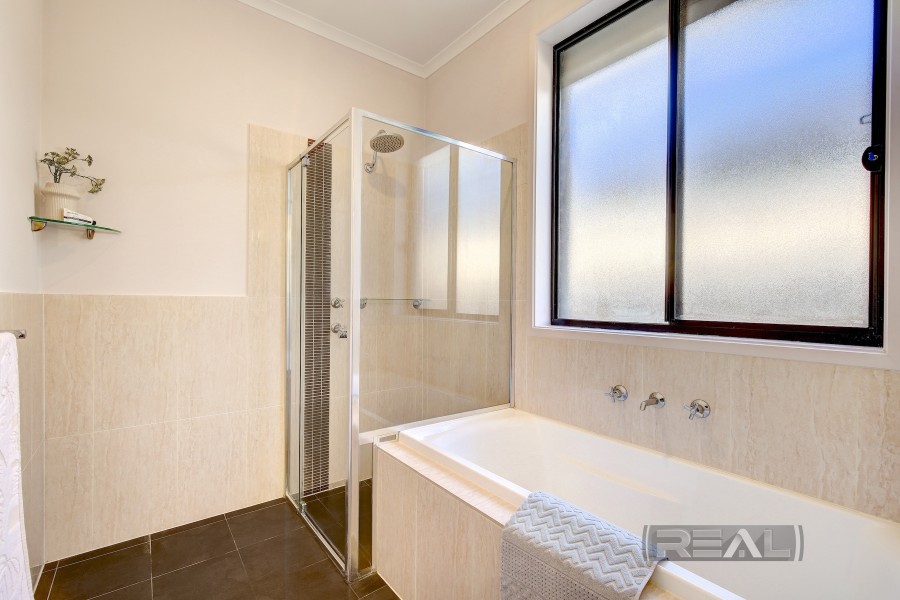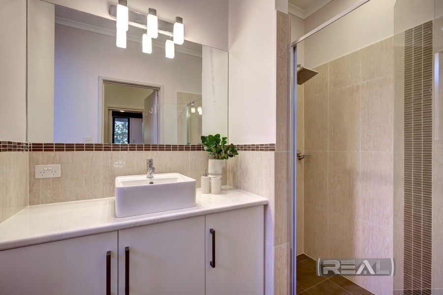 The main bathroom is cleverly designed with a three-way layout to reduce congestion during busy times. The vanity with square basin and large mirror is separate from the wet areas, while the bathroom includes a large bath, chrome and glass shower, separate toilet, heat lamp, a Meranti feature wall, and additional linen storage.