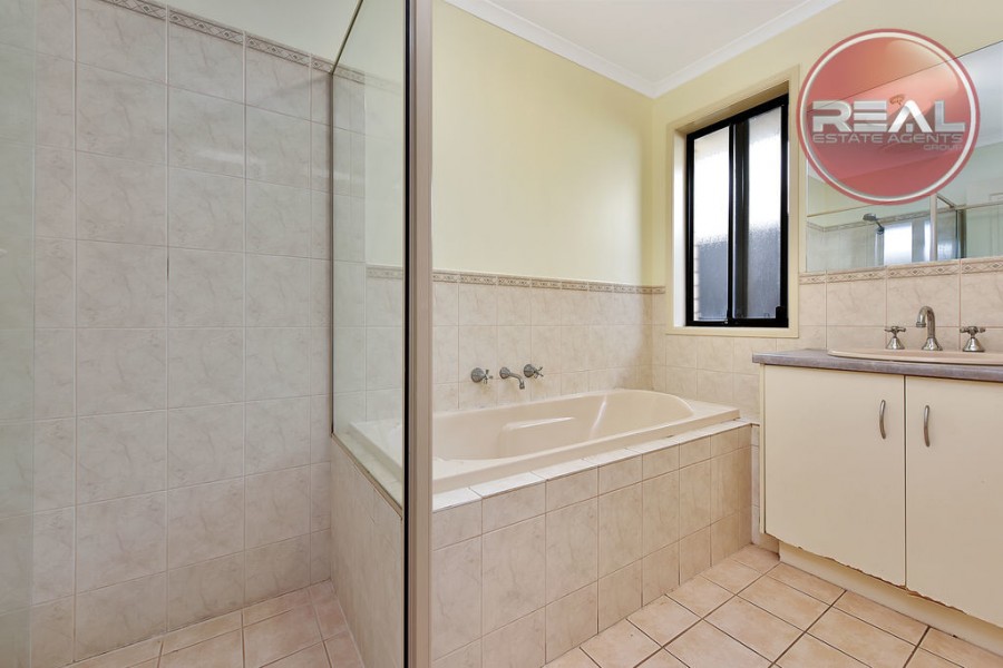 The master bedroom has size to surprise with this perception aided by the elegant bay window. The ensuite echoes the neutral tones found throughout the home and the walk-in robe has an abundance of hanging and overhead storage.