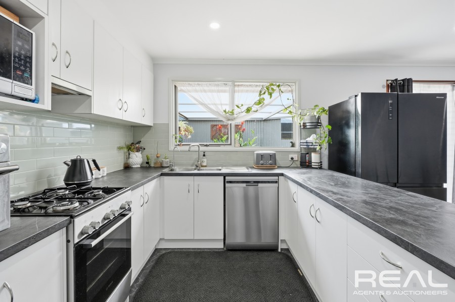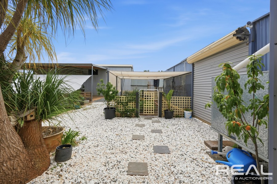The backyard continues to impress with established veggie patches, evergreen garden beds, and a generous lawn ideal for children and pets. A second on-site garage provides even more storage flexibility.