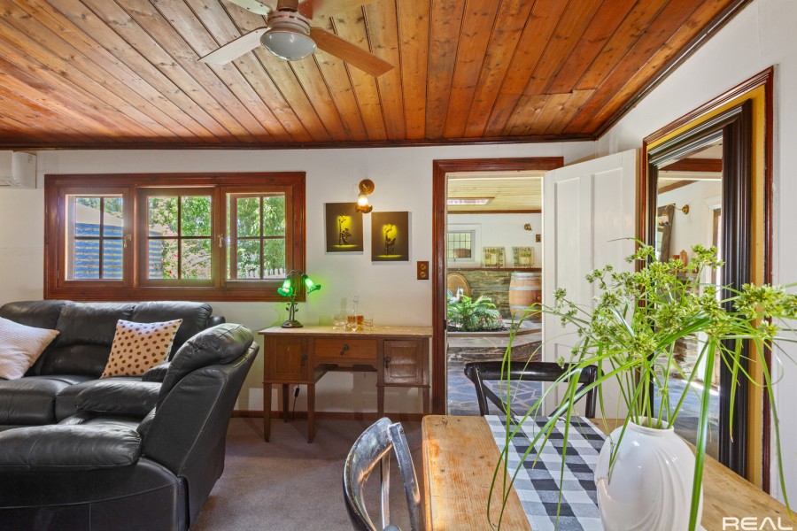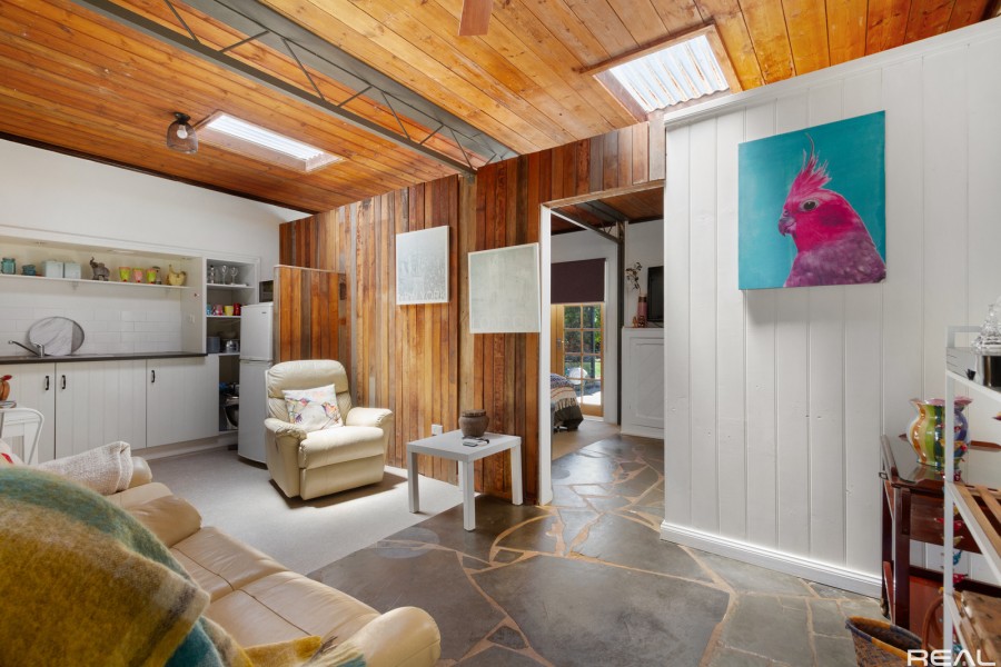 In addition, there is a one-bedroom unit located alongside the BnB. It offers its own lounge room, kitchenette with storage cupboards and microwave oven, skylight, and timber panelling. Comfort is enhanced with a reverse-cycle split system air conditioner and its own hot water service. The bathroom/laundry includes a modern shower, toilet, and vanity. This space is perfect for an older child or as a rental room for additional income.