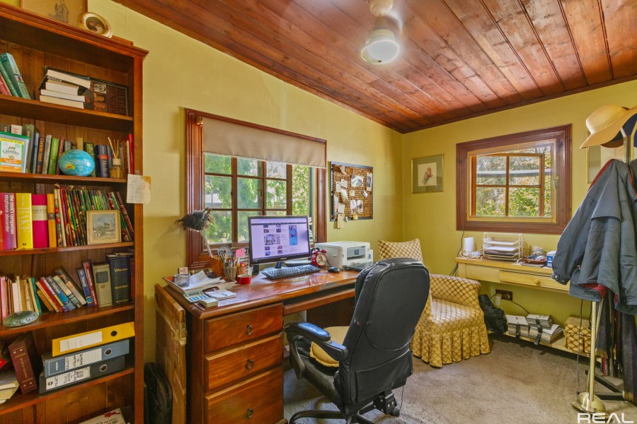 A separate office or study with timber ceilings, carpet, and a ceiling fan creates the perfect quiet space for working or browsing the internet.