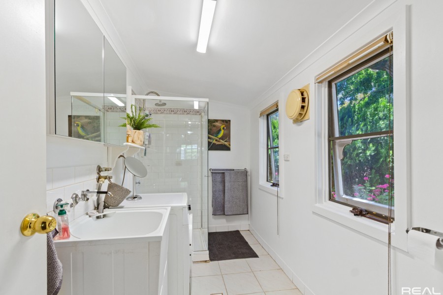 The main bathroom servicing the residence is light and airy, offering a large glass shower, toilet, and laundry facilities.