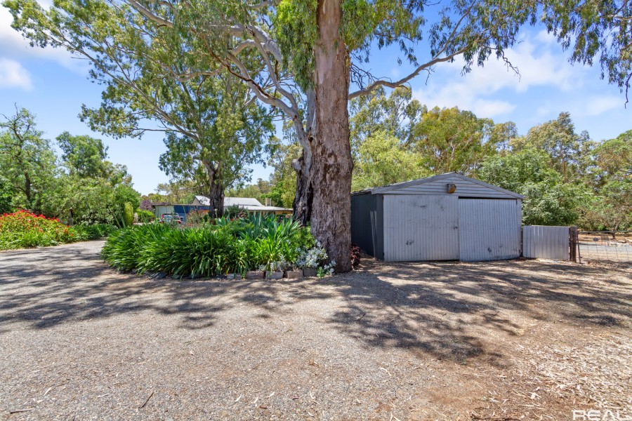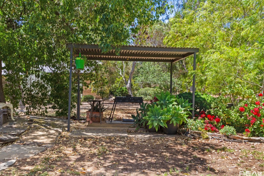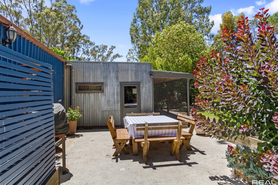 Additional features include a 5.5kW solar system and majestic gum trees that enhance the surroundings. The property also offers six raised wicking garden beds and a large rear double steel garage with concrete floor, lighting, power, and a workbench.