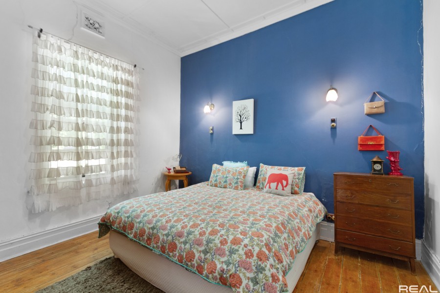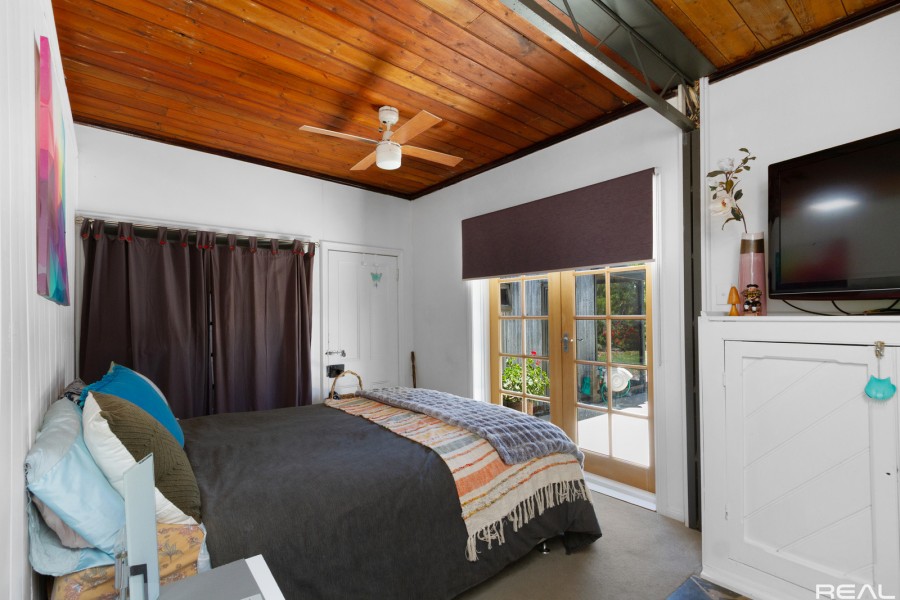 Upon entering through the character front door, you are greeted by high ceilings, timber floors, and an amazing pendant light. The main residence comprises two large bedrooms with timber flooring, with the master bedroom boasting an open fireplace. Both bedrooms are fitted with ceiling fans.